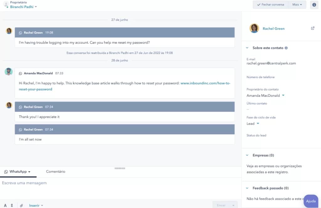 - Visualizar todas as conversas do WhatsApp no CRM da HubSpot e, assim, seu time pode obter visibilidade total de como os clientes estão interagindo com a marca.