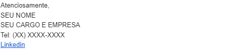 - Ao incluir informações relevantes na assinatura de e-mail, como o cargo, número de telefone, endereço físico ou até mesmo depoimentos de clientes satisfeitos, você demonstra transparência e credibilidade. Isso ajuda a construir a confiança dos destinatários, pois eles podem facilmente encontrar informações de contato e verificar a autenticidade da sua empresa. Para leads de topo de funil, isso pode ser um fator importante no fortalecimento de relação com sua marca.