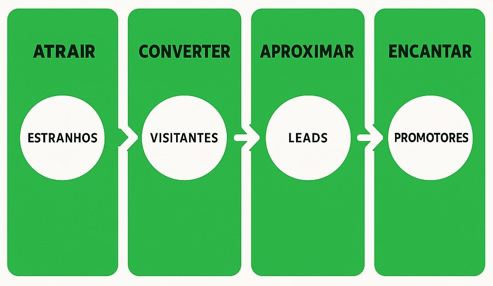 Essas etapas formam o funil de vendas do Inbound Marketing, permitindo que a empresa acompanhe e otimize a jornada do cliente, desde o primeiro contato até a fidelização. Cada fase exige canais e estratégias específicas para garantir que o lead avance no funil e se torne um cliente satisfeito e leal.​