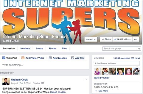 Por exemplo, os membros do grupo de Internet Marketing Super Friends Group com mais de 13.000 participantes, se orgulham em ajudar outros comerciantes da Internet. Os membros podem fazer perguntas sobre SEO, obter recomendações para designers e ferramentas e muito mais.
