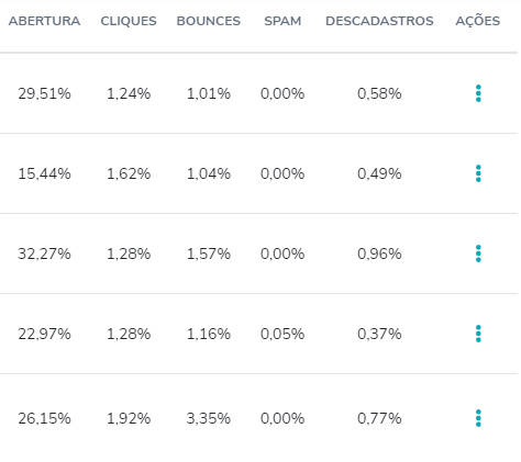 No RD Station Marketing, da RD Station, por exemplo, ao selecionar Relacionar > Email você consegue ver a lista dos últimos disparos e os principais dados sobre cada um deles.