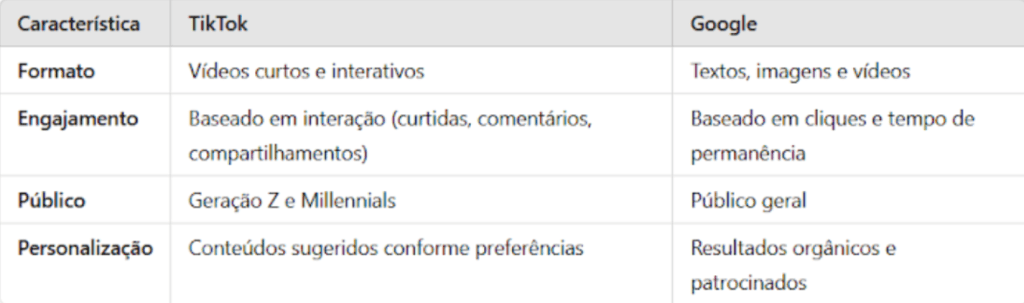 Em suma, enquanto o Google é um mecanismo de busca tradicional baseado em textos e páginas indexadas, o TikTok oferece uma busca visual, com conteúdos mais curtos e diretos.