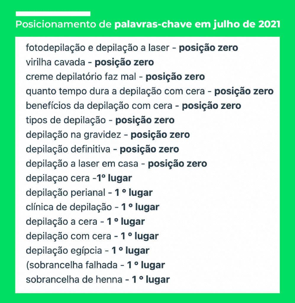 Foi no mesmo ano que, através do gerenciamento de técnicas de SEO, foi conquistado o primeiro lugar para a palavra-chave “depilação à cera”, que é justamente o produto essencial da franquia.