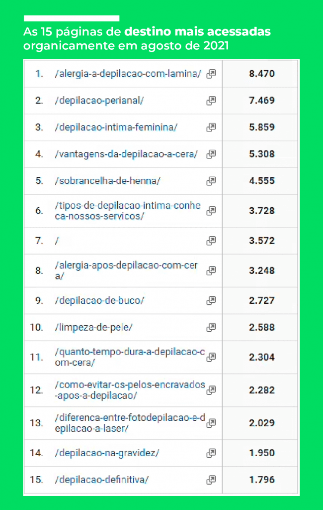 Ao publicar conteúdos no seu blog, o Pello Menos tem mais páginas indexadas no Google em comparação com um site comum e hoje as páginas mais acessadas organicamente são de conteúdos que reforçam os serviços da rede de depilação, o que incentiva a procura e coloca a franquia como referência no assunto.