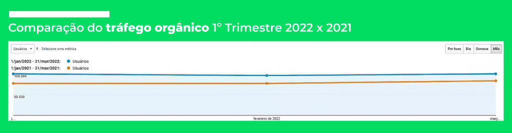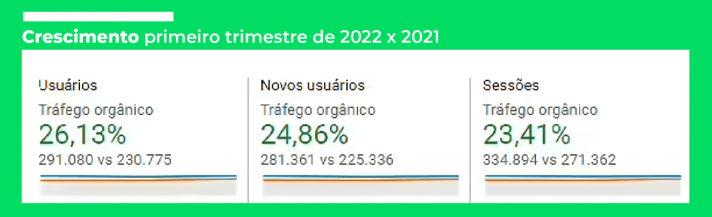 O tráfego orgânico correspondeu a 92% de todo o tráfego do site no 1º Trimestre de 2022. Além do crescimento de mais de 20% em usuários, novos usuários e sessões, se comparado com o mesmo período de 2021.