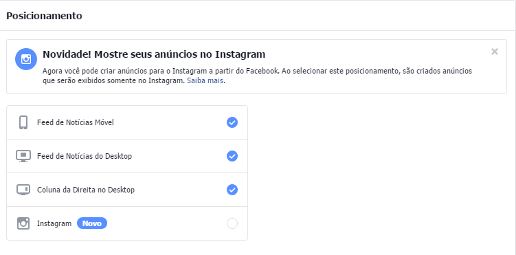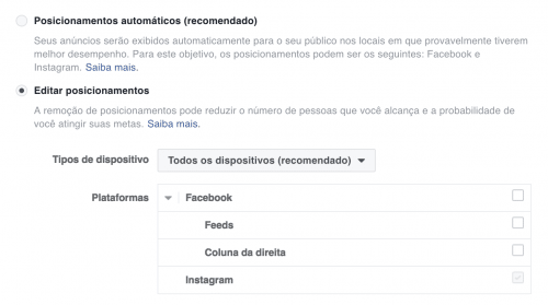 - Configure os posicionamentos: na seção de posicionamentos, selecione “Editar Posicionamentos” e marque apenas a opção “Instagram” para que seus anúncios sejam exibidos exclusivamente nessa plataforma;
