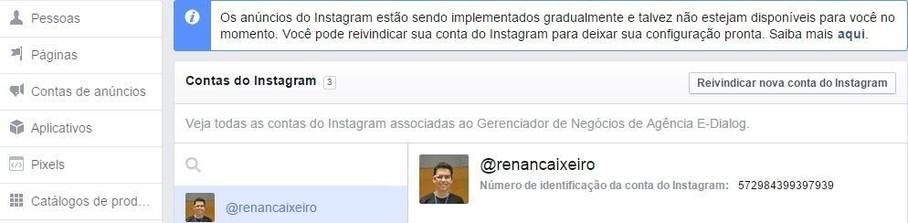 - Adicione sua conta do Instagram: Em “Configurações” > “Contas do Instagram”, adicione sua conta do Instagram para integrá-la ao gerenciador de negócios;