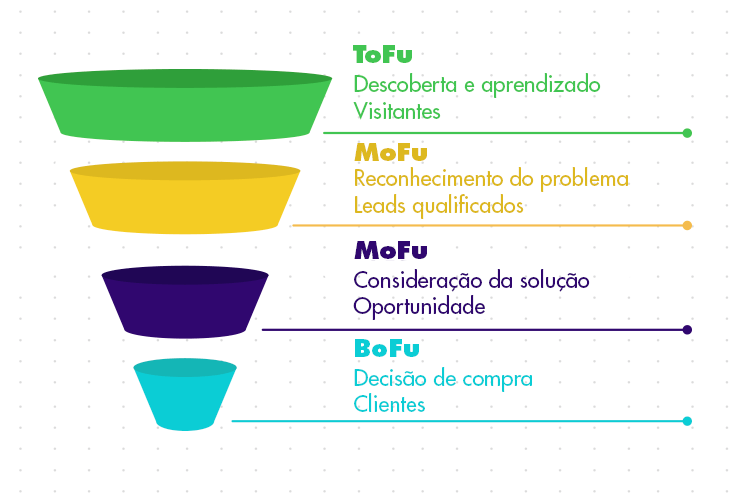 O funil de vendas é dividido em três etapas: topo do funil (ToFU), meio do funil (MoFu) e fundo do funil (BoFU).