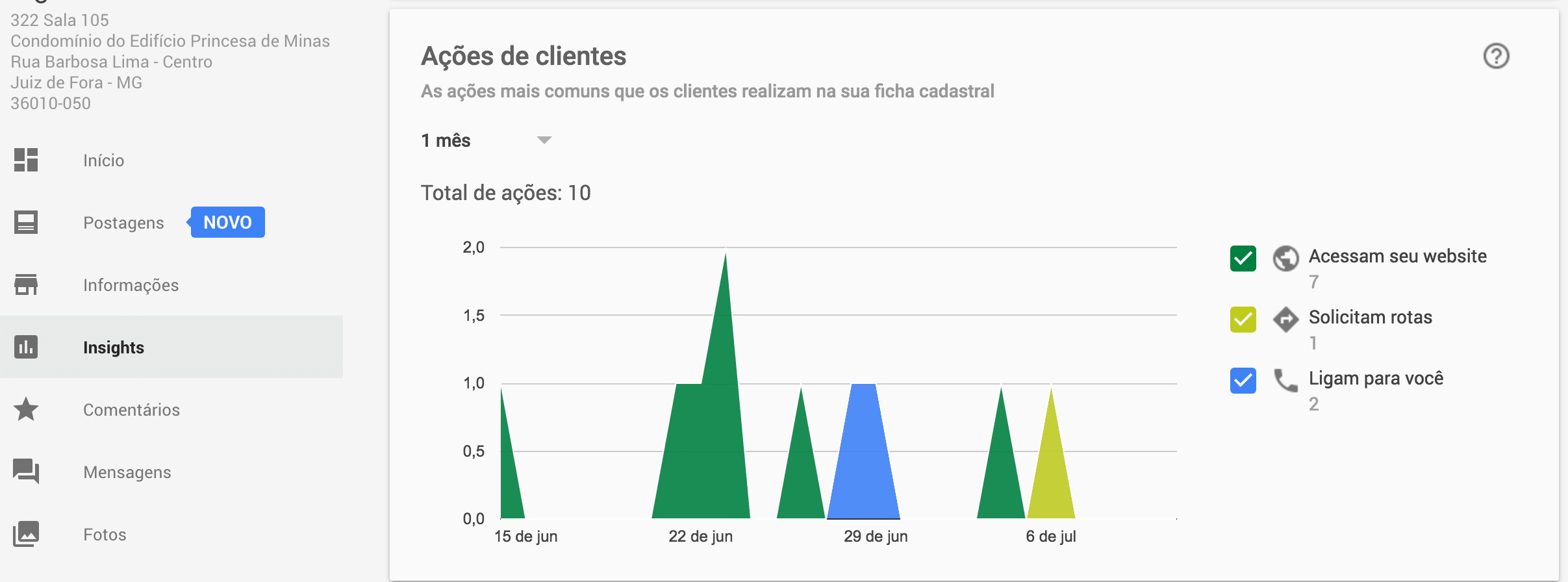A Dica chave é sempre ficar de olho no Google Meu Negócio Insights. Faça isso para identificar as lacunas em sua estratégia e melhorar sua presença no Google (exemplo abaixo).