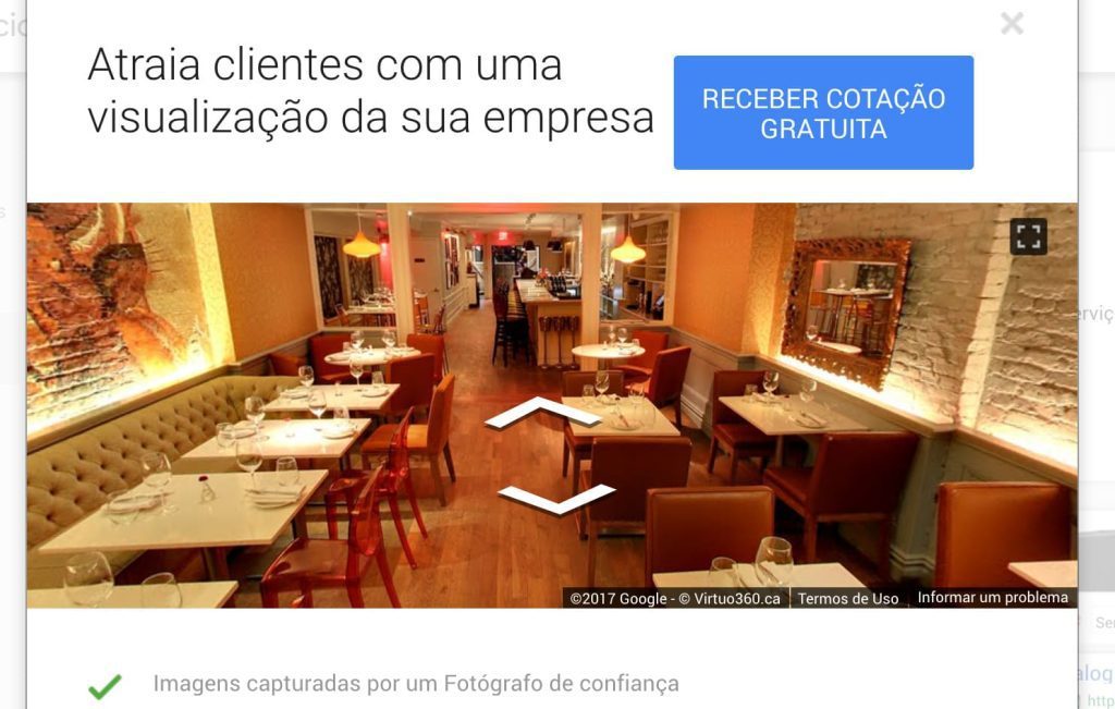A outra opção é contratar um fotógrafo para criar uma tour interno com Street View (o Google faz essa cotação pra você!). Isso vai mudar o link “Ver por fora “para “ver por dentro”. Isso vai aparecer no Google Maps e na busca do Google e é definitivamente uma ótima opção para mostrar a seus usuários o que eles podem esperar quando visitar o seu negócio.