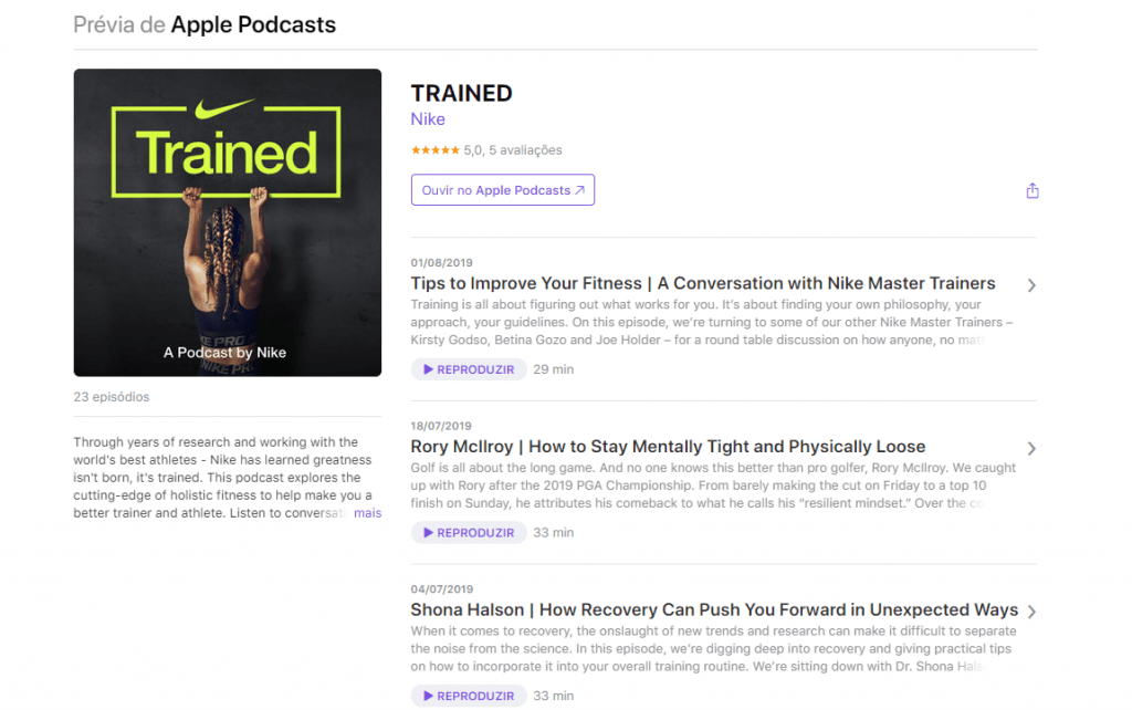 A partir desses números já dá para entender que o podcast pode muito bem integrar sua estratégia de marketing digital. Basta achar um que tenha a temática alinhada com seus produtos ou serviços para fazer uma boa divulgação. Mas, e por que não fazer o próprio podcast? Algumas marcas já vem investindo no ramo, como é o caso da Nike.