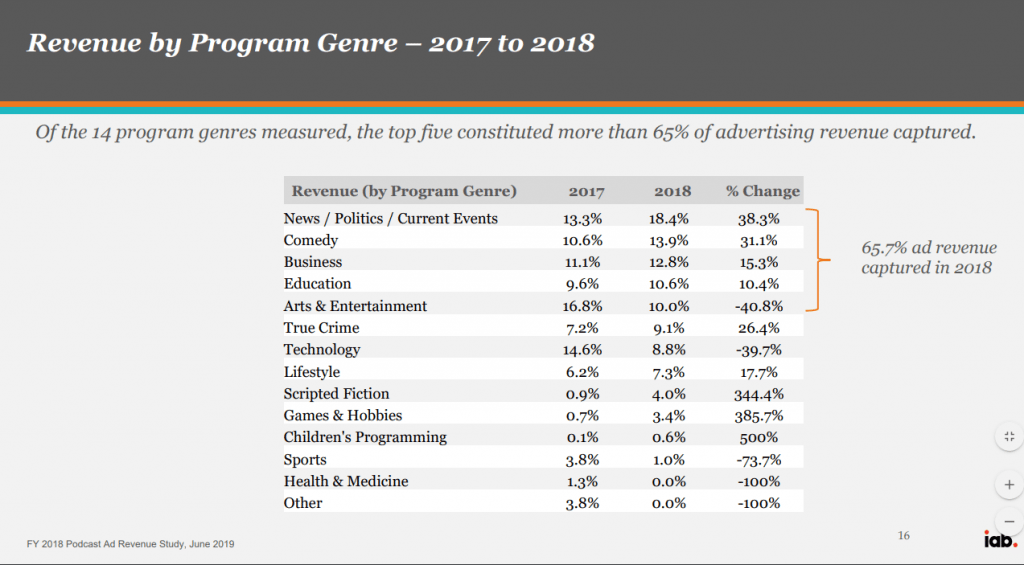 De acordo com a análise detalhada de podcast nos EUA preparado pela PwC, os temas com maior receita de publicidade são: notícias, política e atualidades; comédia; negócios; educação e arte e entretenimento.