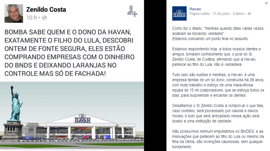 Em junho, a Havan também passou pelo mesmo problema, uma pessoa postou em seu Facebook que tinha fontes seguras de que o filho do Lula era dono da Havan e que ela recebia dinheiro do BNDES. Prontamente a marca postou em sua página oficial o post de acusação com uma resposta, pedindo para que essa acusação fosse provada.  Resultado: a pessoa que escreveu o post, pediu desculpas e disse que aquilo era apenas um boato, o post da Havan teve mais de 7 mil curtidas e 3 mil compartilhamentos e esse boato deixou de ser verdade.
