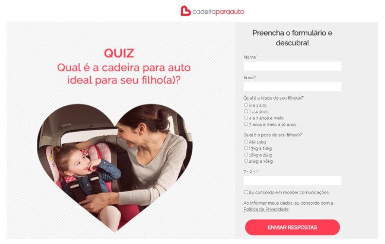 Landing Page com quiz para ajudar na escolha da cadeirinha ideal: