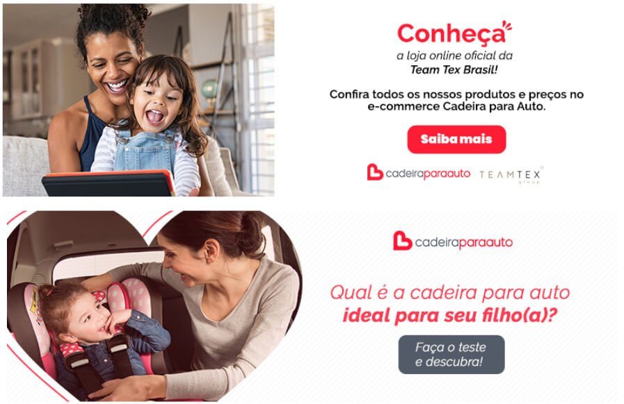 Nas redes sociais e conteúdos via e-mail, reforçamos a associação entre a marca Team Tex Brasil e o Cadeira Para Auto, com o objetivo de destacar que se trata de um e-commerce oficial e que os clientes têm toda a segurança e comodidade para comprar por esse canal.