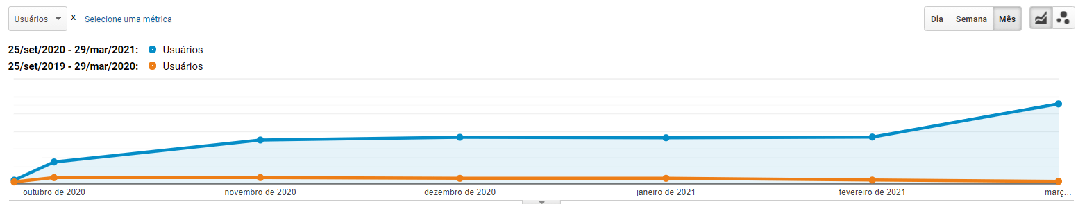 Ao longo de 6 meses de projeto (do fim de setembro de 2020 ao fim de março de 2021), o site da VBMC Consultores conquistou um crescimento de mais de 800% de acessos e novos usuários, em relação ao mesmo período do ano anterior, com as estratégias de mídia paga e SEO. Confira o gráfico comparativo e a tabela abaixo: