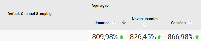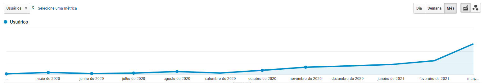 Em relação ao desempenho orgânico, os resultados de crescimento são ainda mais impressionantes, com aumento de 785% em usuários e 821% em novos usuários. No gráfico abaixo, é possível observar a curva de desenvolvimento dos acessos desde o começo do projeto: