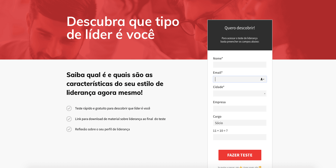 • Ainda no tema, publicamos um teste também de Liderança para focarmos no público com interesse na área, adquirindo também uma ótima taxa de conversão da Landing Page, 54% ainda no início do projeto.